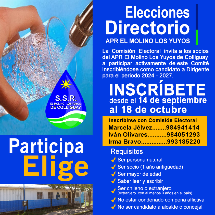 La Comisión Electoral del Comité de Agua Potable Rural (APR) El Molino Los Yuyos de Colliguay anuncia la apertura del proceso de inscripción de candidatos para formar parte del directorio del período 2024-2027. La Comisión Electoral, recientemente constituida en la Asamblea Extraordinaria, invita a todos los socios interesados en asumir un rol activo en la gestión y desarrollo del APR a postularse como candidatos.